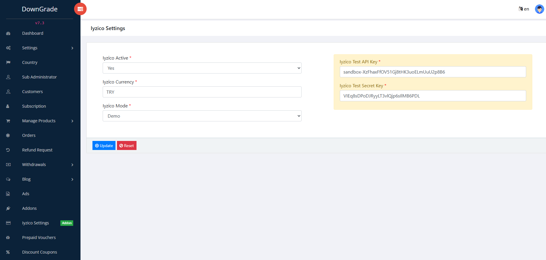 • Iyzico Test Secret Key - if you can choose demo mode, you can change Iyzico test secret key here