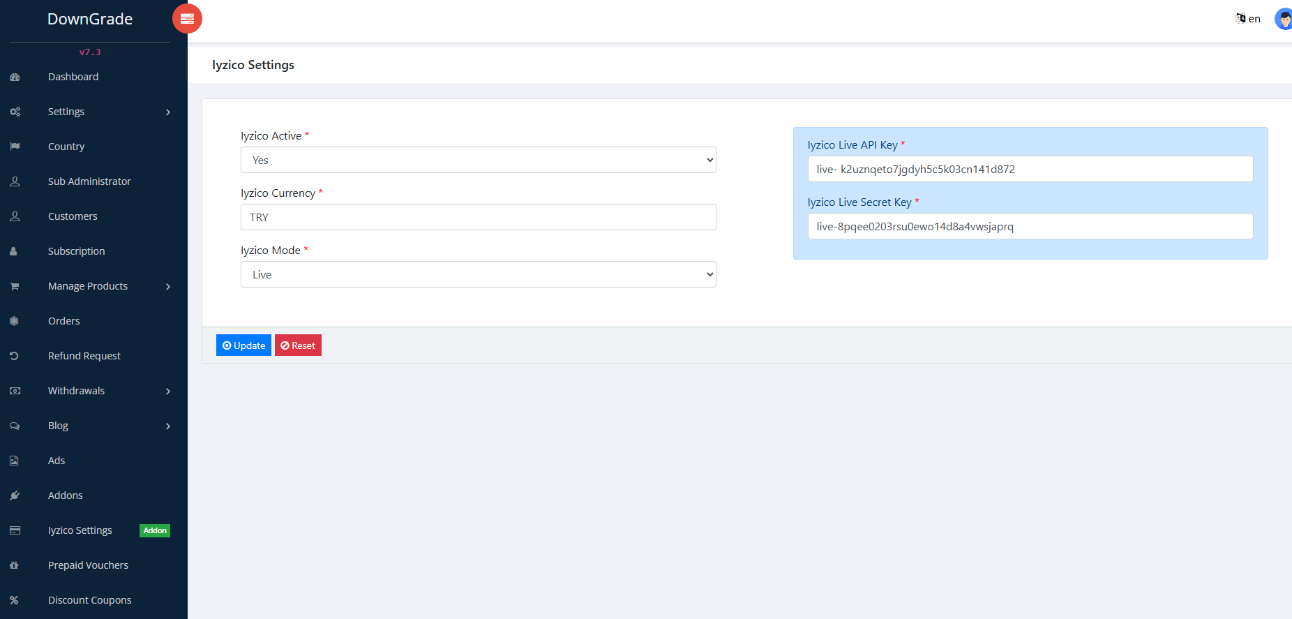 • Iyzico Live API Key - if you can choose live mode, you can change Iyzico live api key here