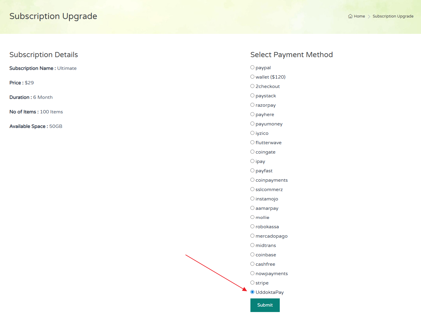 And put your envato addon purchased code and choose the UddoktaPay.zip file that was downloaded from the CodeCanyon and click on Submit.